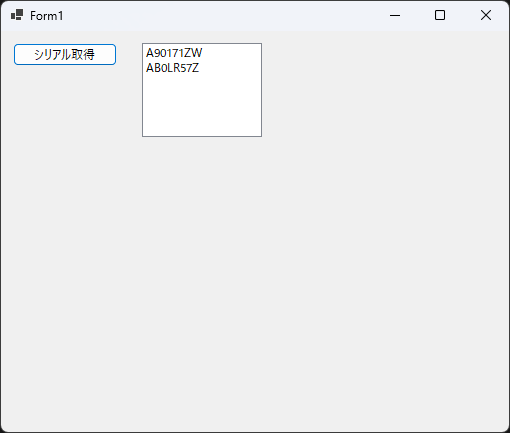 フォームにボタン「GetSerials_button」とリストボックス「Serials_listBox」を追加し、ボタンのクリックイベントにFTDIのシリアル番号を取得するプログラムを書きます。