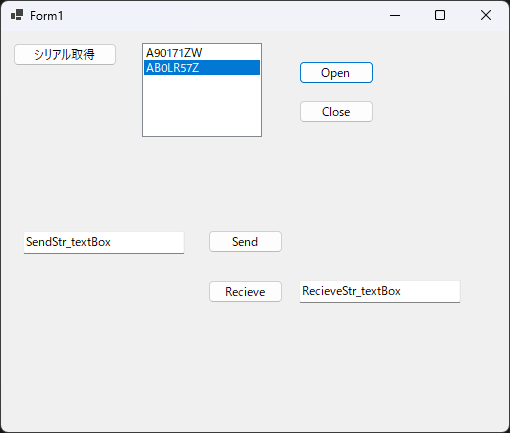 次にOpen_buttonとClose_buttonを追加し、次のようにします。リストで選択したシリアルで接続と切断ができるようになります。さらに、送受信ボタン、送受信文字列用のテキストボックスを用意し次のようにします。文字列通信の区切り文字は送受信ともに”\r\n”ということにします。